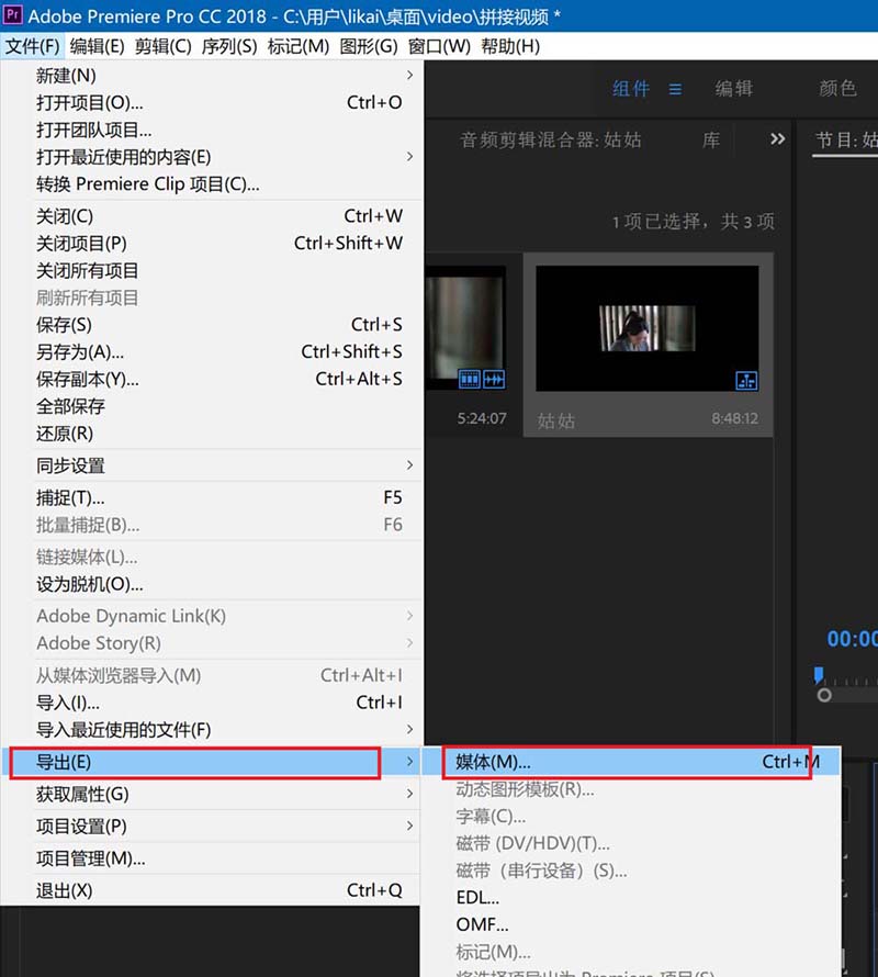 7、修改好的視頻可以通過文件,導出,媒體命令來實現文件的另存為。