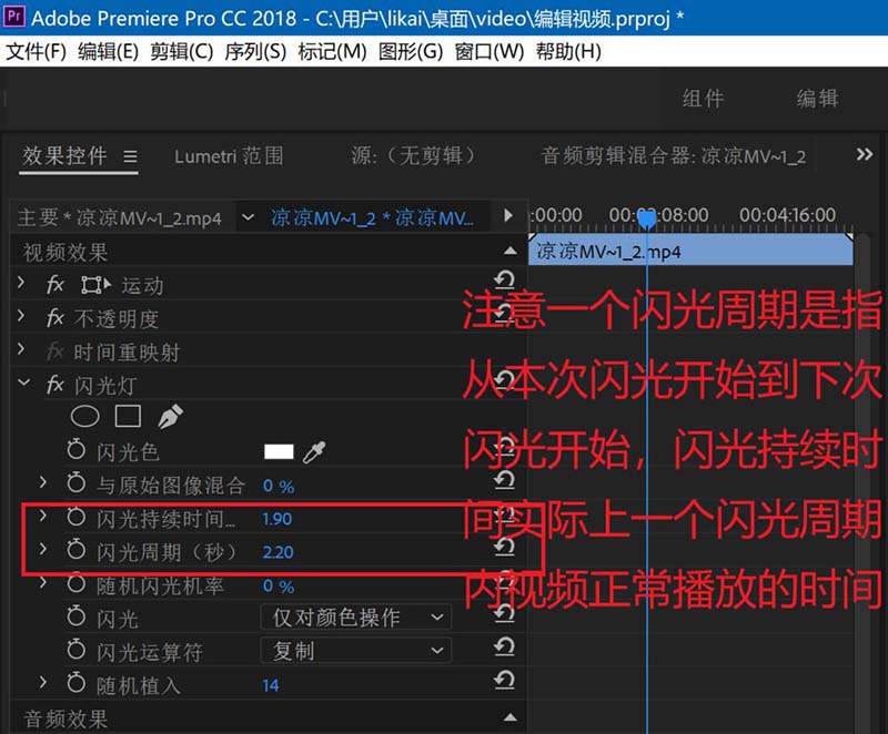 6、在左側的效果控件,然后調節效果參數,如下圖紅框所示,請注意圖片中的文字描述,這個將嚴重影響視頻閃光效果。