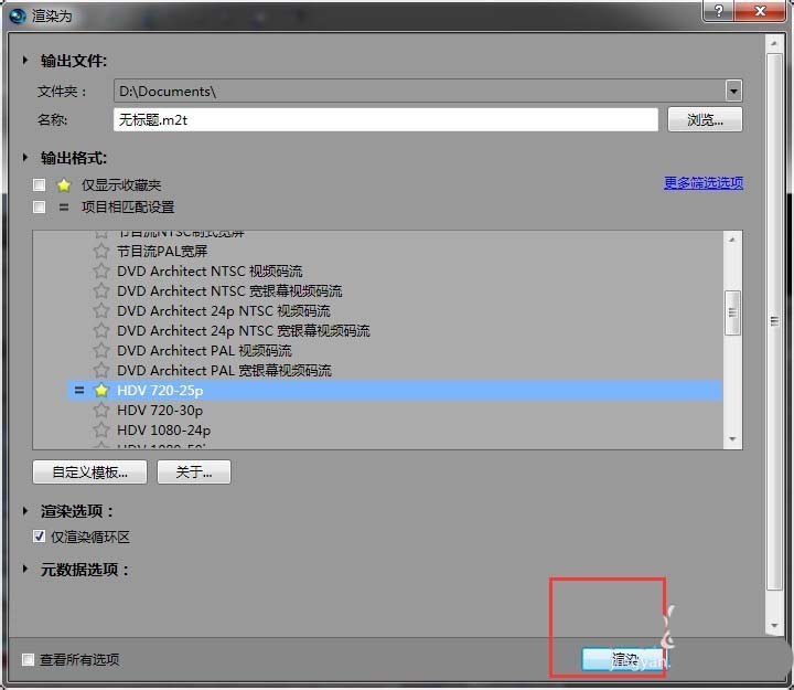 4、在渲染格式的選擇上,我們根據(jù)視頻的屬性選擇:720P模式的MPG格式。
