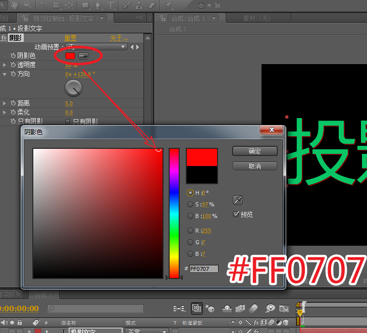 3、調(diào)整陰影效果的參數(shù),完成文字投影的制作。