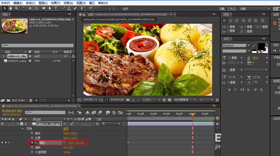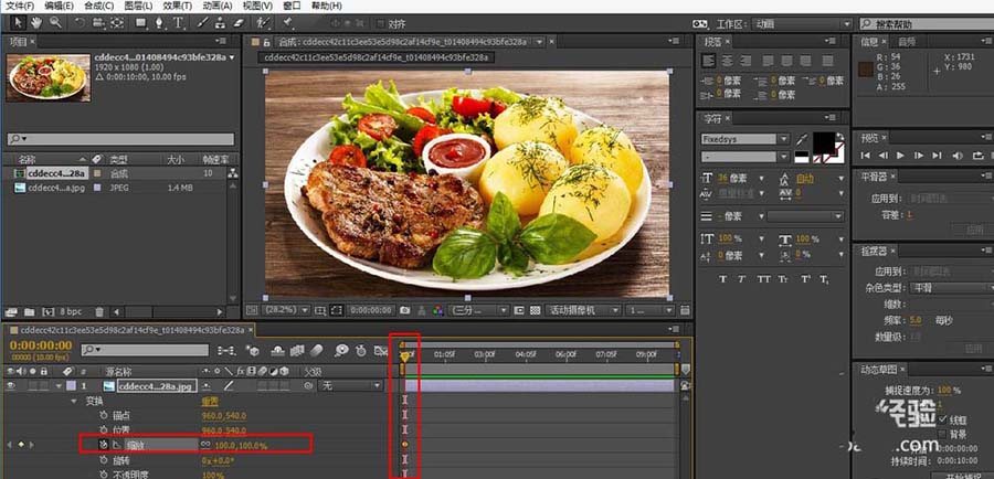 4、將關(guān)鍵點放在開始,激活縮放,保持縮放比例在百分之百