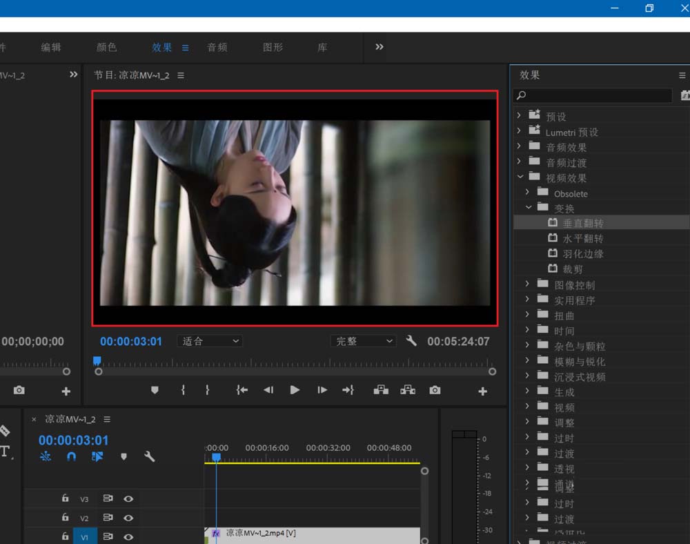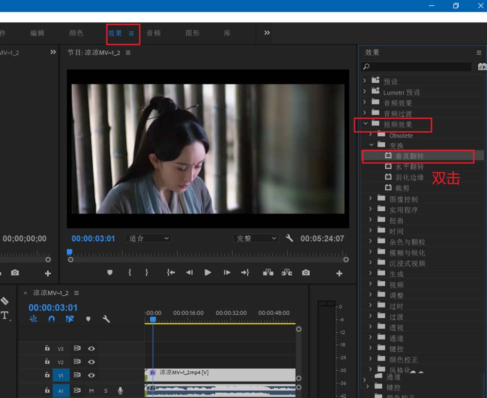6、選中視頻軌道后,單擊上方的效果,然后在右側(cè)依次找到視頻效果,變換,垂直翻轉(zhuǎn)。進(jìn)行雙擊。