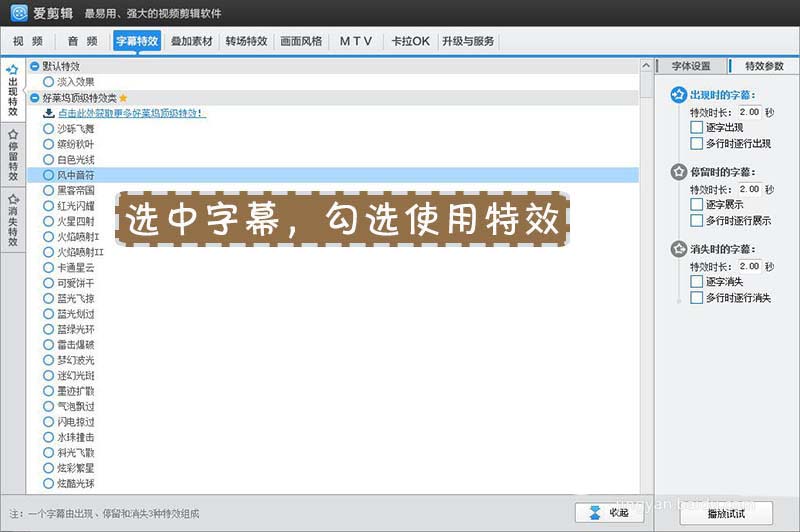 1、選中已添加的字幕,在“字幕特效”面板勾選,就可以成功添加使用字幕特效了。