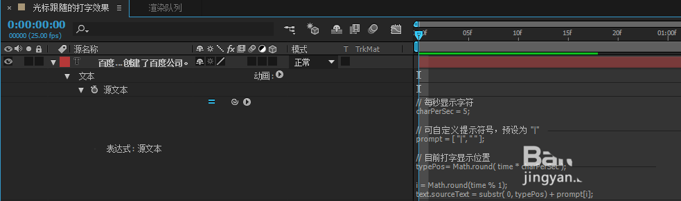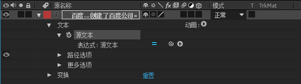 3、單擊文字圖層,單擊文本前面三角,按住ALT鍵單擊源文本前面的小馬表,調出源文本的表達式選項;在表達式窗口輸入以下代碼: