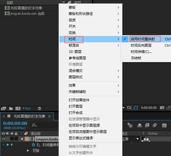 5、在預合成上右擊,在彈出菜單中選擇時間中的時間重映射,在不同的位置打上關鍵幀,框選所有的關鍵幀F9添加緩動效果,并調整速度曲線就好。
