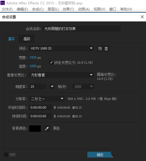 1、打開AE新建項目并新建合成,設置合成的名稱為“光標跟隨的打字效果”,合成的大小為1920*1080,合成的持續時間為3秒鐘;