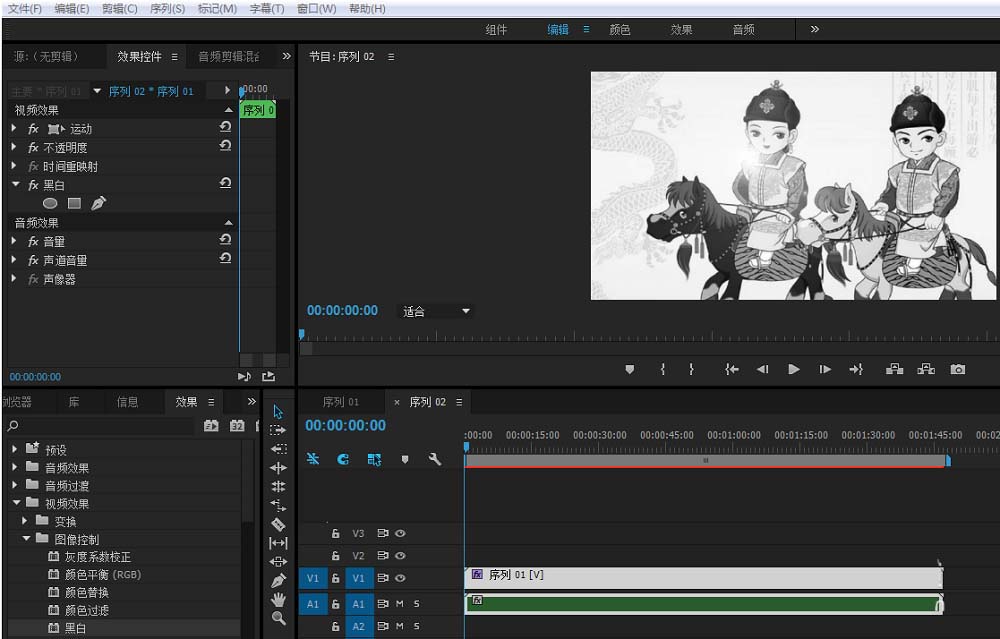 6、將視頻效果中的黑白效果添加到序列2中的素材上。