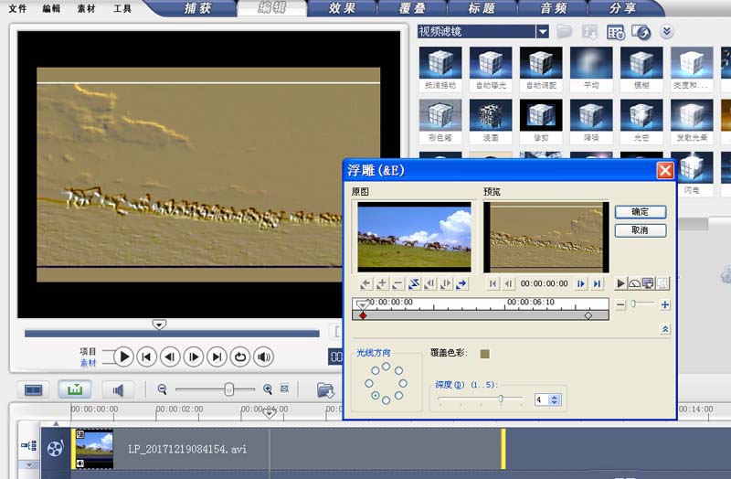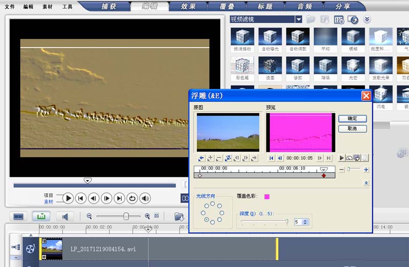 2、在編輯菜單中找到視頻濾鏡選項,從中選擇浮雕并拖拽到視頻軌道上。