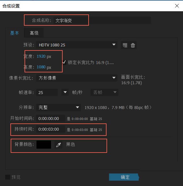 1、打開AE新建項目新建合成文件,設置合成文件的名稱為“文字漸變”、畫面大小為1920*1080、合成持續時間為3秒、背景顏色為黑色;