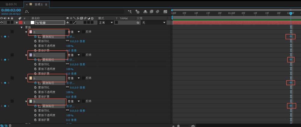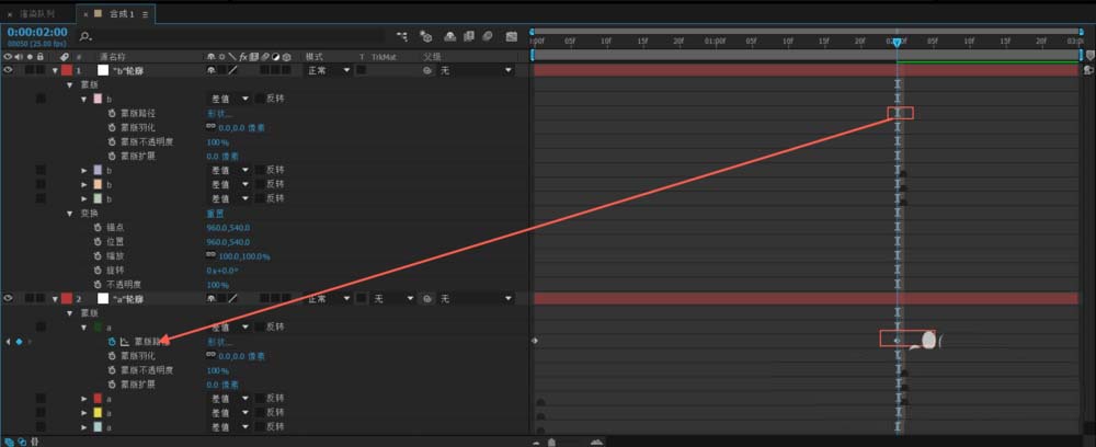 5、將指針定位到2秒位置,單擊圖層b前面的小三角,選中蒙版下面的所有圖層,單擊前面的小三角,給”蒙版路徑“打上關鍵幀;