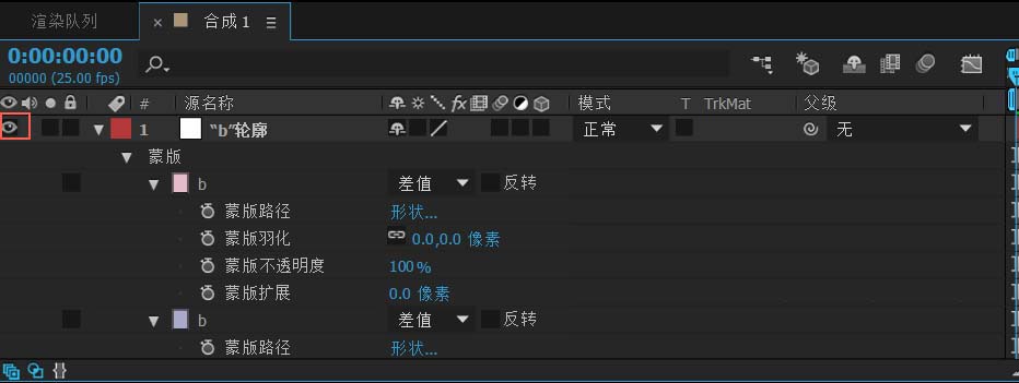 4、將指針定位到0秒,單擊圖層a前面的小三角,選中蒙版下面的所有圖層,單擊前面的小三角,給”蒙版路徑“打上關鍵幀;