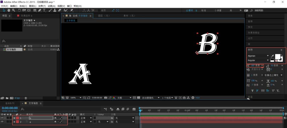 2、單擊"文字"工具,建立兩個文字圖層,分別輸入"A"和"B"、設置文字的字體、大以及字體顏色;