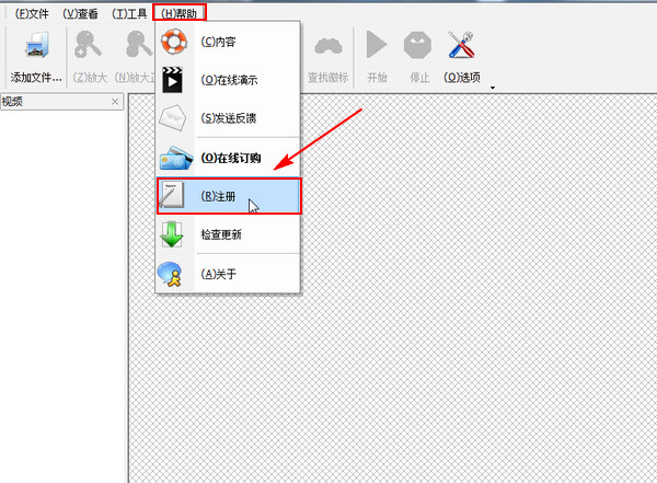 因為這款軟件現(xiàn)在是沒有進行注冊的,所以我們現(xiàn)在要將軟件進行一個注冊操作,注冊與不注冊的區(qū)別就在于不注冊的時候只能保存時間為一分鐘的視頻,注冊之后則沒有時間限制。點擊“幫助”菜單下面的“注冊”按鈕。