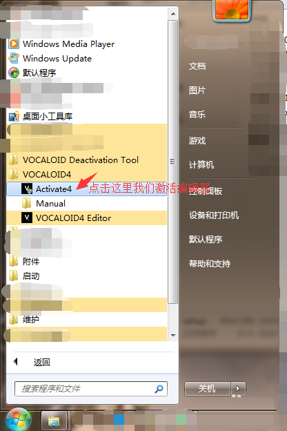 1、在電腦的開始菜單找到Vocaloid4,點擊圖中所示的文件,開始激活,選擇語言,選擇綁定設備,輸入激活序列號,點擊next