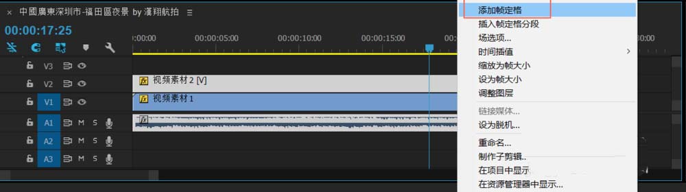 1、【添加幀定格】用來對播放中的素材突然定格;右擊需要靜止的軌道視頻(本例為V2軌道)在彈出菜單中選擇【添加幀定格】,這樣位置就被切割,后面的位置就變成了凍結幀;