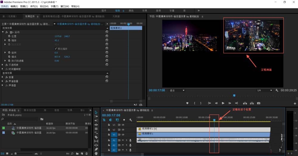 Premiere中樂意凍結幀,下面我們就選擇了擇了兩段長度為30秒的視頻,視頻分別在V1軌道和V2軌道制作了凍結幀的效果,請看下文詳細介紹。