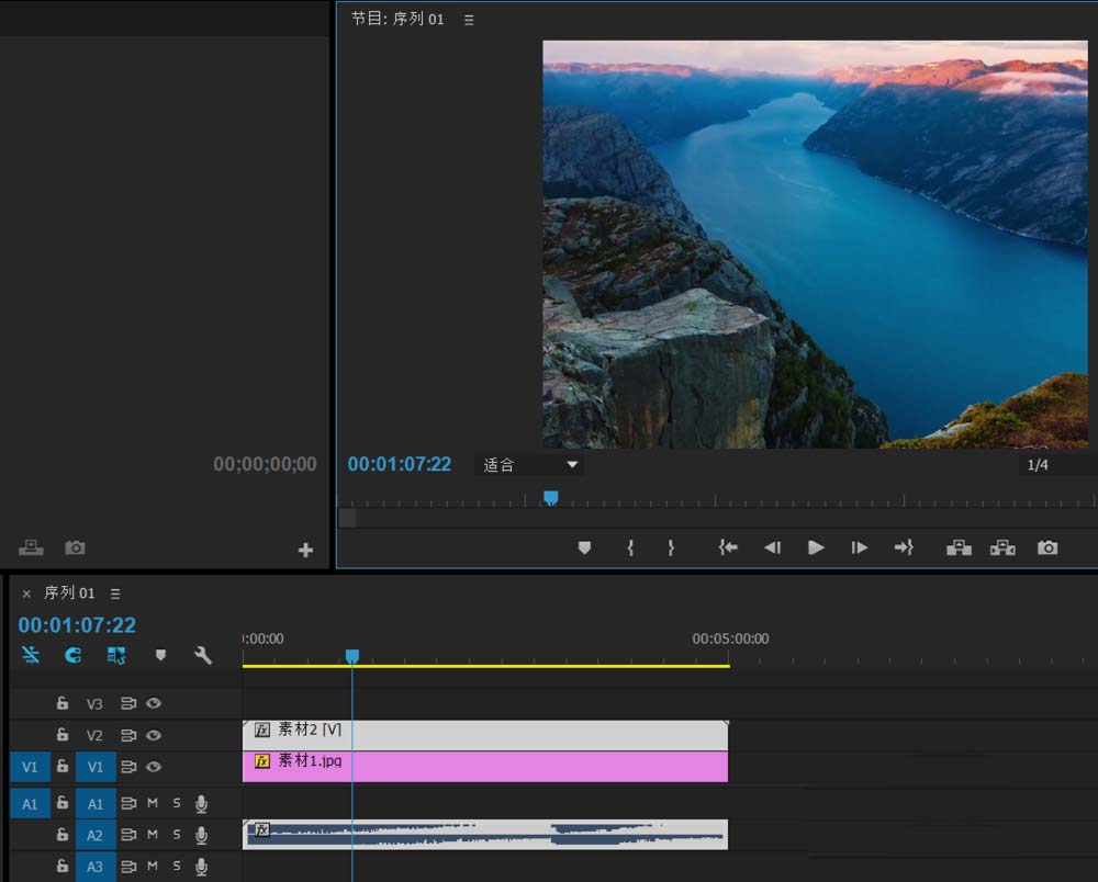 4、將素材1.jpg拖動到視頻1軌道,將素材2.mp4拖動到視頻2軌道,調整圖片素材的長度,使之于視頻時間相等;
