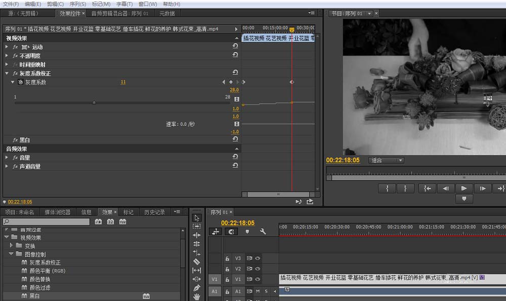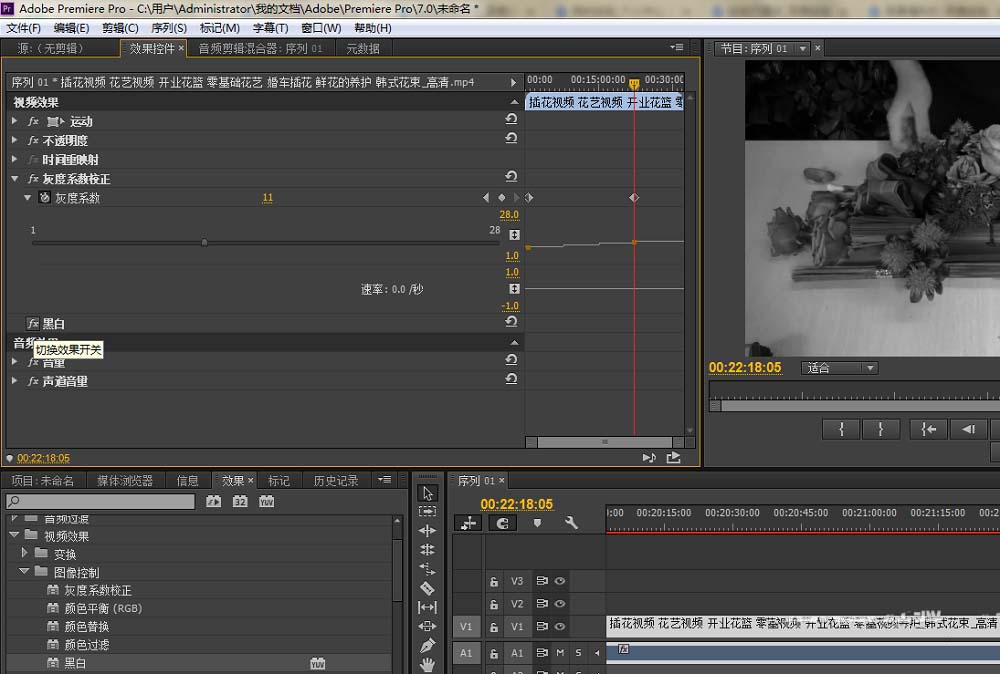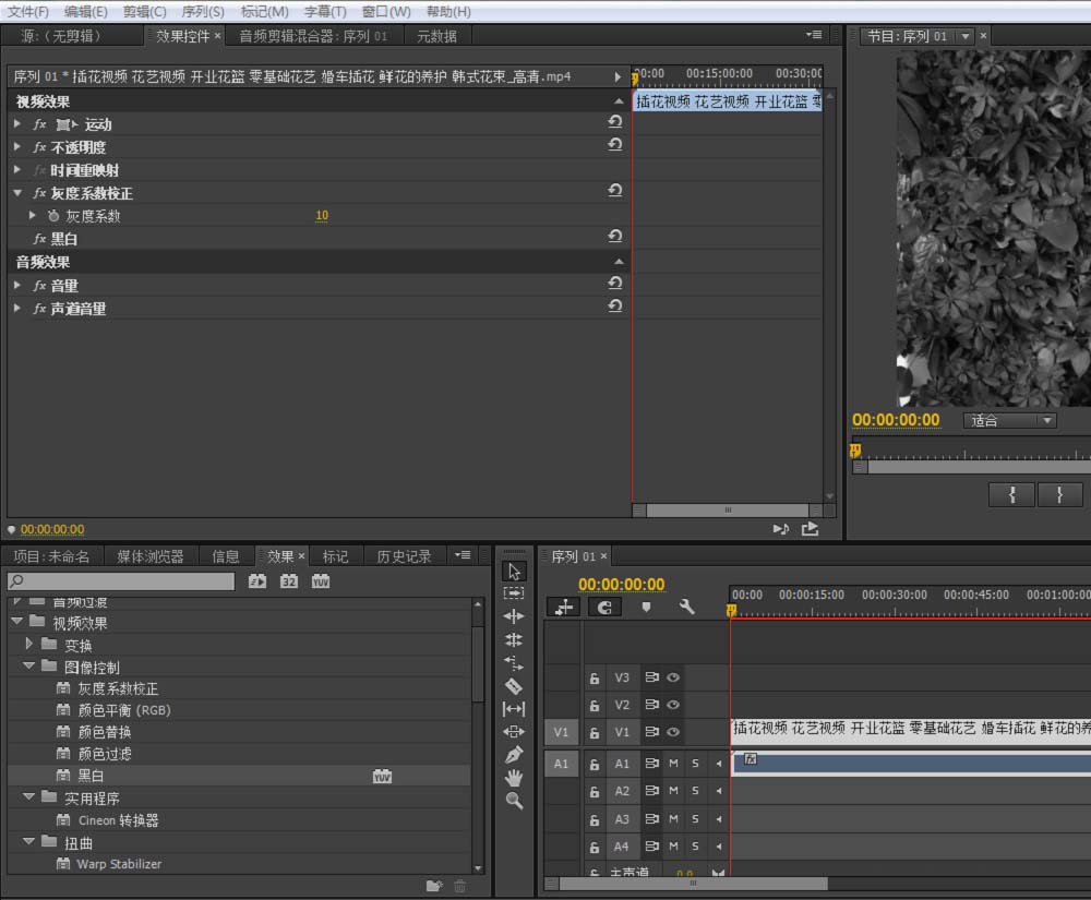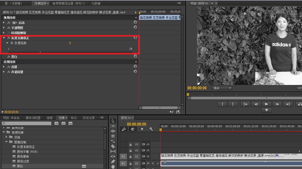 3、激活效果面板,找到視頻效果:黑白,灰度系數校正。