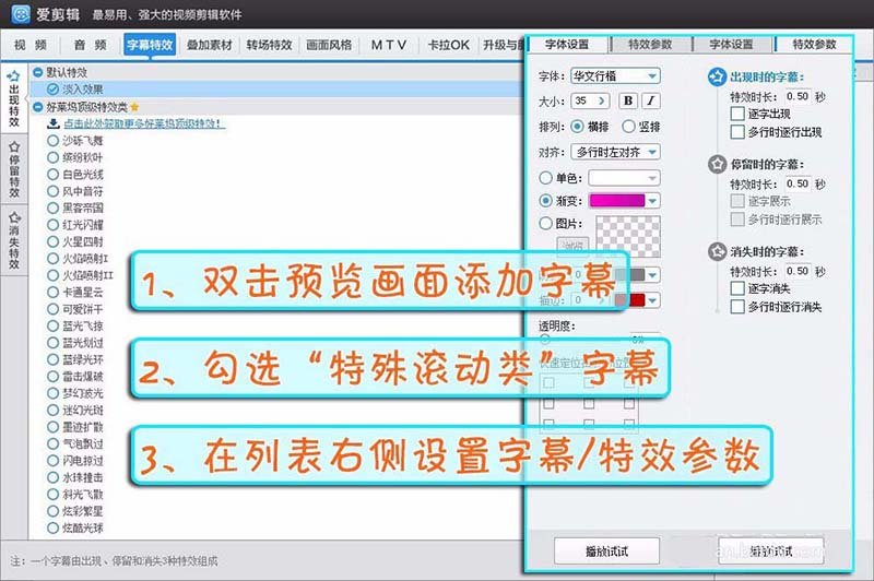 2、在“字幕特效”面板,雙擊預覽畫面,在彈出框中輸入字幕的內容,字幕就添加成功啦,預覽畫面的左側列表中有豐富的字幕特效,選中字幕,雙擊特效即可使用。在界面的中央有“字體設置”和“特效參數”兩個選項卡,可以對字幕的字體、大小、顏色還有時長等等隨意設置。