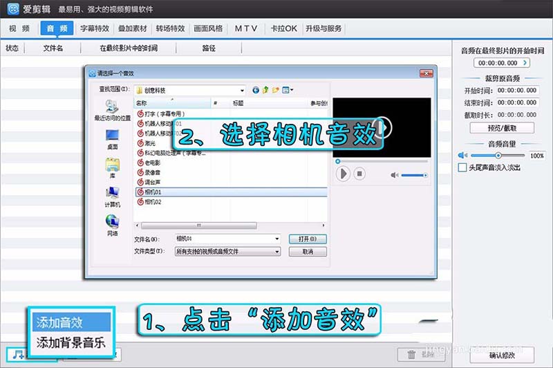 1、在“音頻”面板,點擊列表左下角“添加音頻”—“添加音效”,在彈出列表中選擇相機的音效,插入到閃光開始的時間就可以啦~