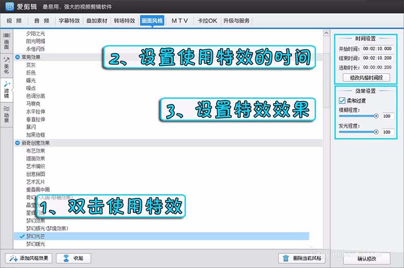 1、在“畫面風格”面板,點擊“濾鏡”左側欄,然后在列表中選擇“曝光”、“夢幻光芒”等效果,雙擊即可使用。然后在界面中央,可以設置效果的時長和效果。