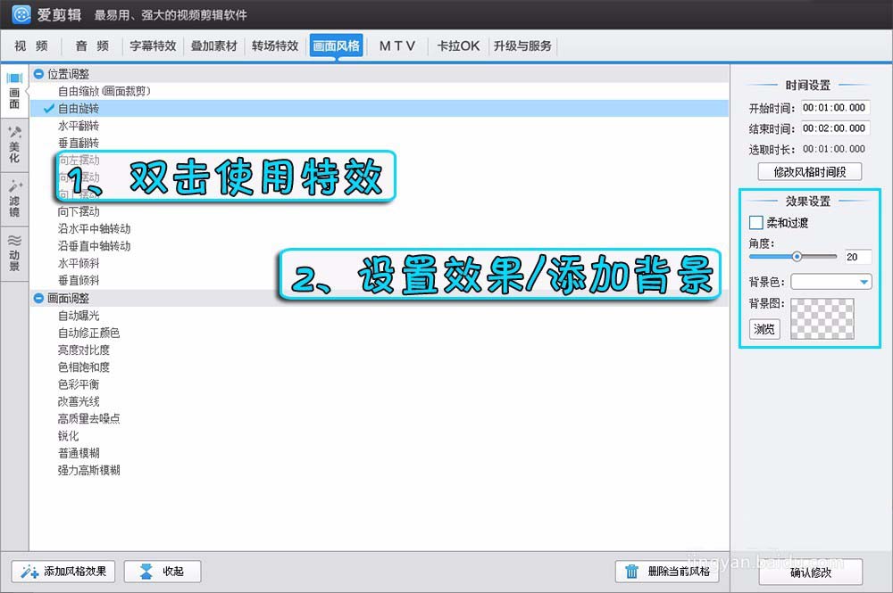 1、在“畫面風格”—“畫面”列表,選擇“自由縮放”、“自由旋轉”等,都可以做到這樣的效果。