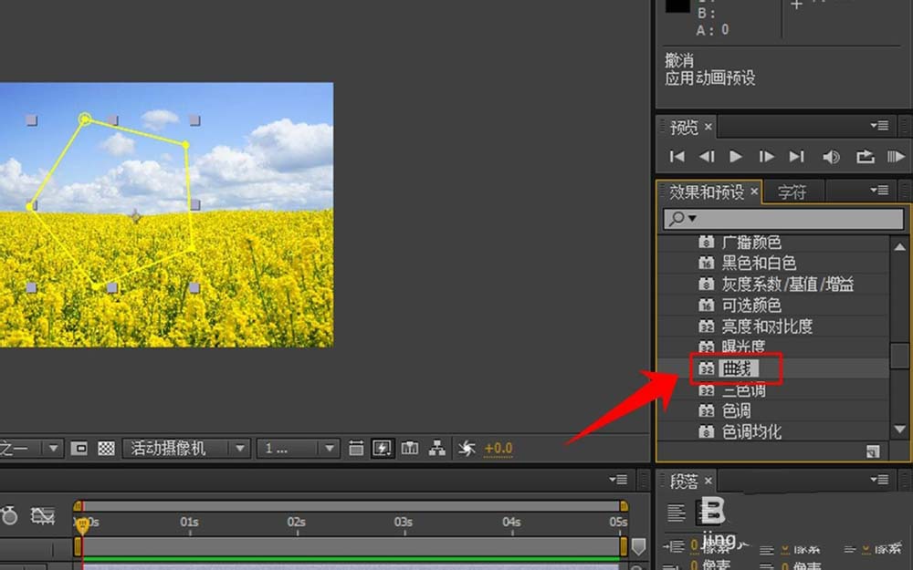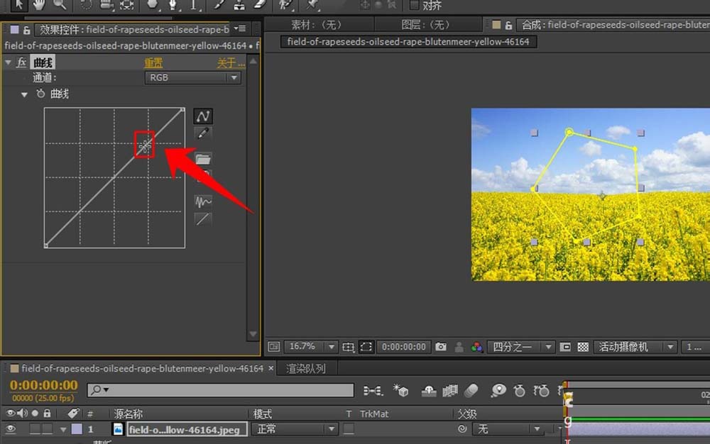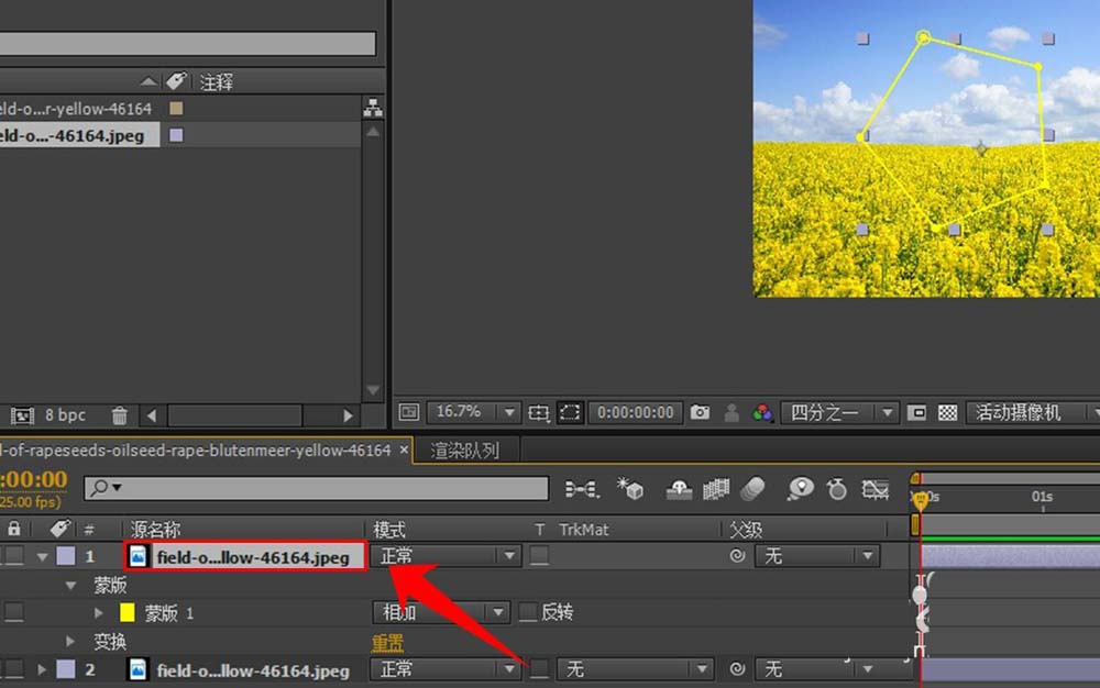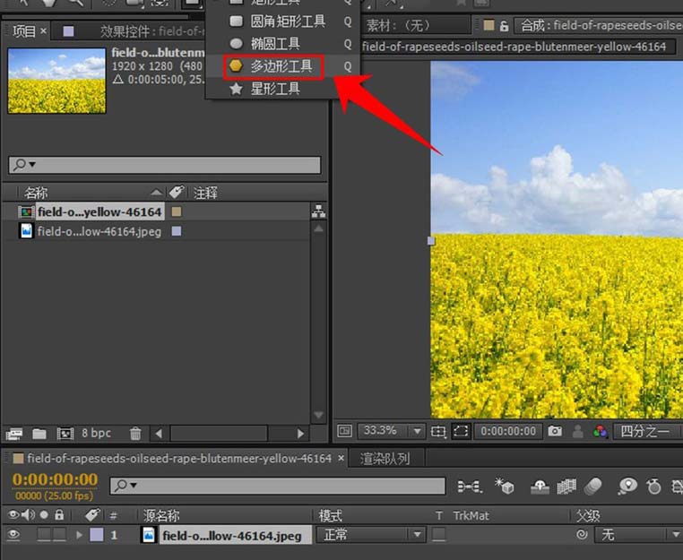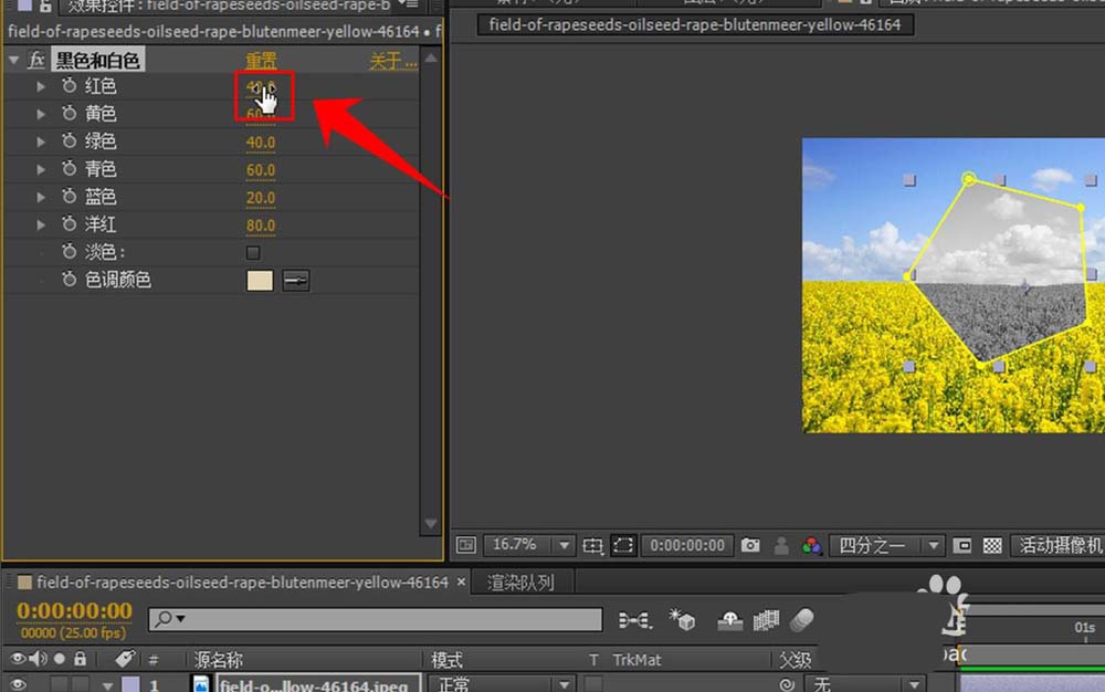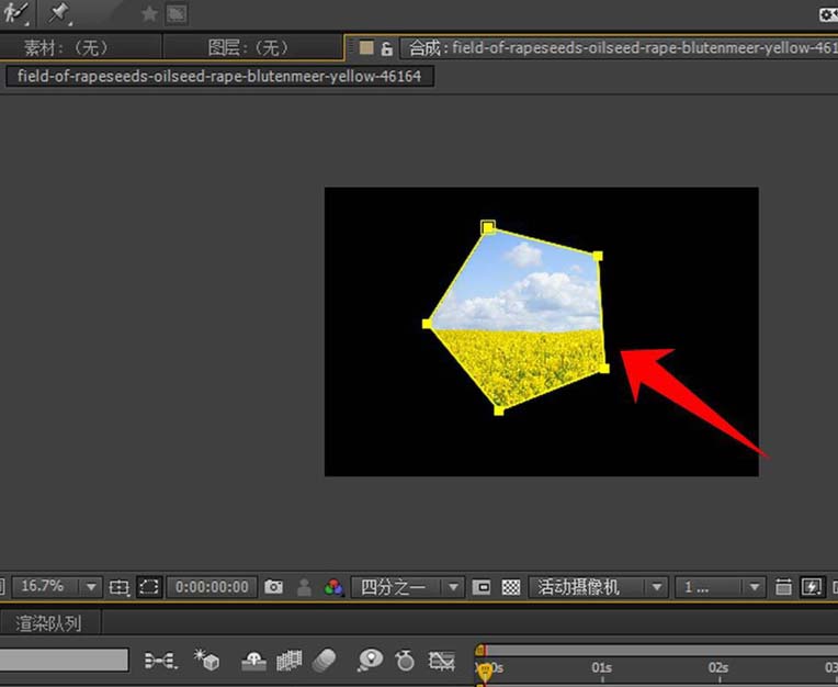 3、插入圖形。選擇好圖形工具之后,在合成窗口中將要進行局部調色的位置拖動,生成多邊形,如圖所示。從圖中可以看出,圖形以外的內容消失了,為了將消失的部分再重新添加上,請繼續按下面的步驟進行操作。