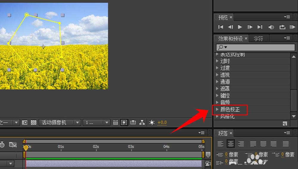6、選中顏色校正。選中第一個素材之后,再拖動預覽窗口右側的滾動條,在列表中找到【顏色校正】選項,點擊該選項,展開下一層列表。