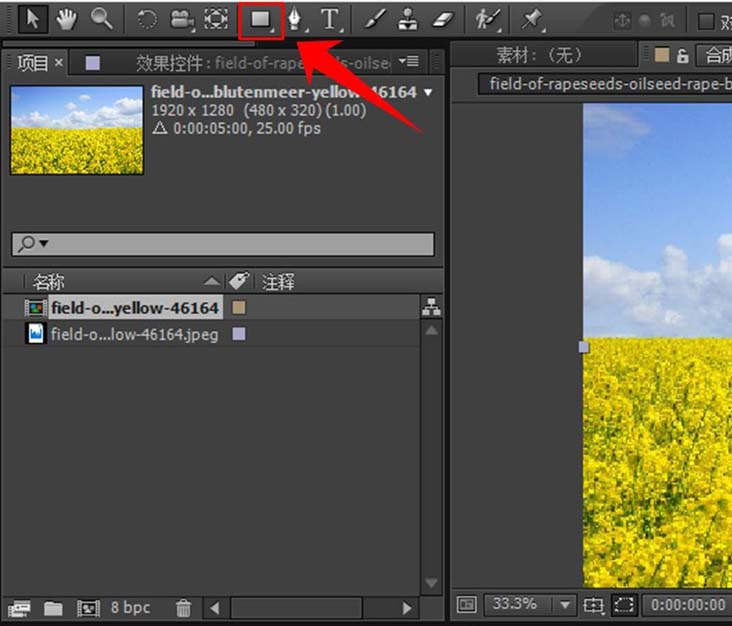 1、長按圖形工具圖標。先將素材素材導入并拖動到時間線窗口中,然后在ae軟件的快捷菜單欄中找到圖形工具的圖標(圖上指示位置),長按該圖標。