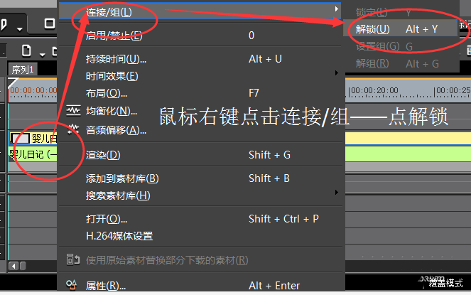 1、我們把視頻拖動到視音頻軌道上在視頻線上——點擊鼠標右鍵——連接/組——解鎖;