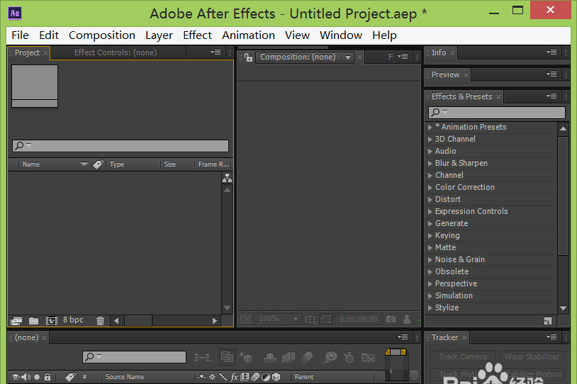 1、打開ae這款軟件,進入ae的操作界面,如圖所示:
