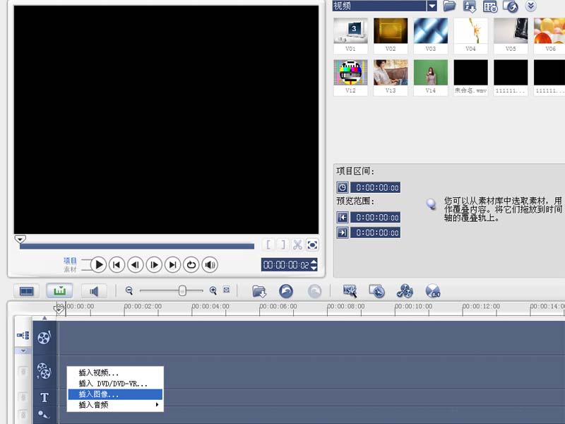1、首先啟動會聲會影10,切換到覆蓋菜單,在覆蓋軌道上右鍵單擊從下拉菜單中選擇插入圖像選項。