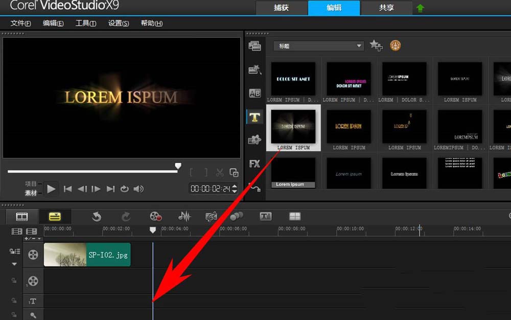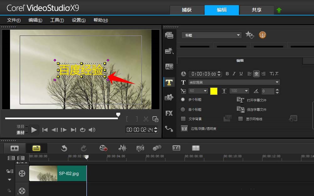 1、新建文件并導入素材。打開會聲會影X9軟件,在導軌中添加好圖片或是視頻素材,然后在“編輯”頁面中選擇“T”型的符號——標題,如圖。