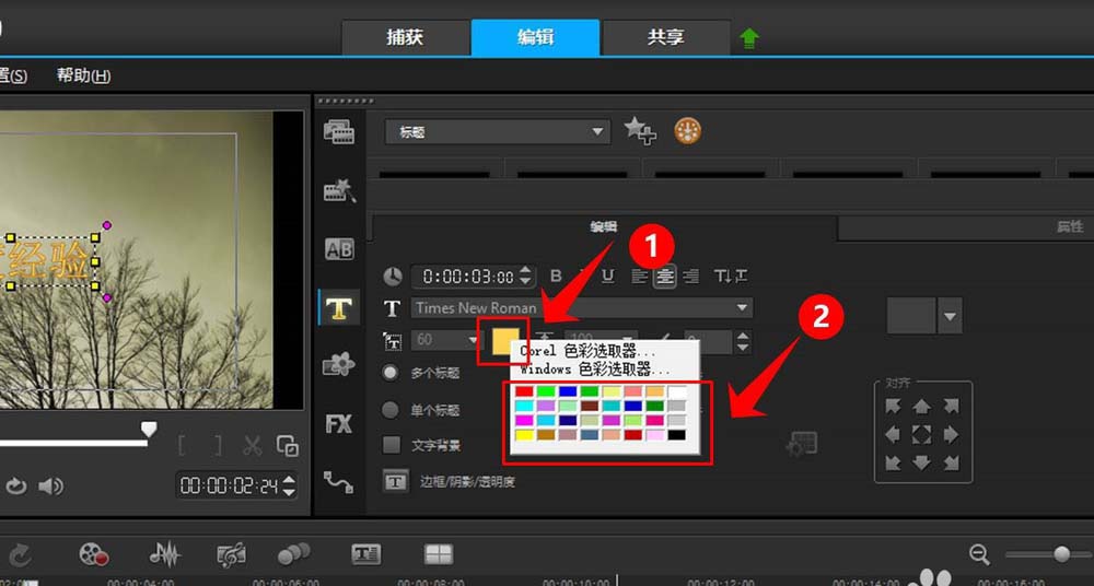 7、更改文字顏色。點擊圖示1位置的色塊,就會在右側(cè)出現(xiàn)更多的色塊,在這些色塊中選擇其中一種,完成文字顏色的更改。