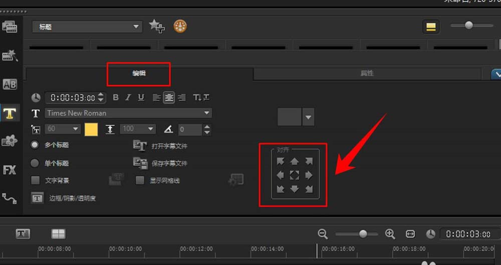 5、選擇對齊方式。在右側(cè)的編輯頁面中找到“對齊”,該軟件提供了9中對其方式,如圖紅色線框內(nèi),點擊該紅色線框內(nèi)的任意圖標,對文字進行對齊。小編演示的案例是選擇的文字居于整個屏幕的中間。