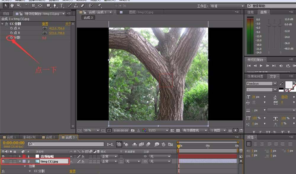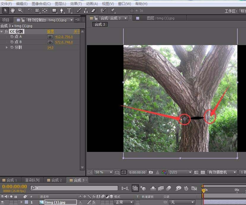 3、在新建第二個合成,將樹的圖片拖進來。再給樹添加一個分割效果。點擊效果/扭曲/分割。將分割的AB兩個點分別放置開口部分,如圖所示。 這是我們改變分割參數,發現樹已經開口了。