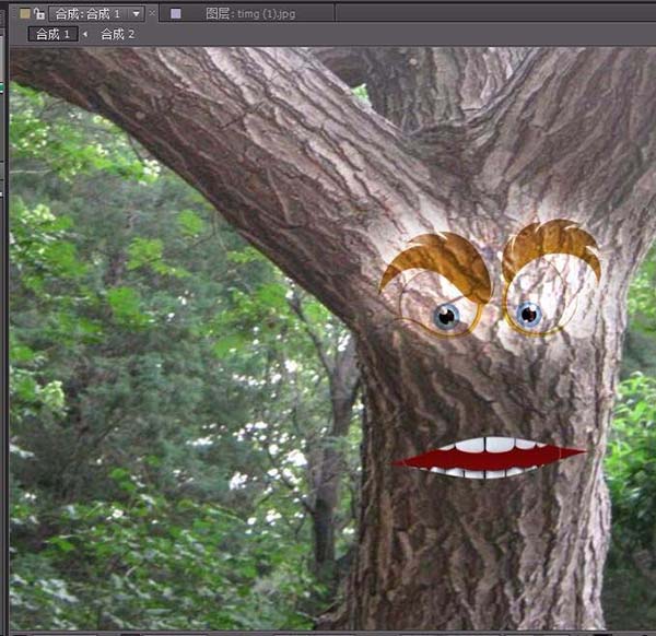 7、好了現在預覽一下,樹的嘴巴已經配合聲音開始說話了。最后把眼睛圖片拖至第一層調整大小和模式,再把牙齒合成拖放到最后一層,調整合適大小。好了我們的圖片說話已經制作好了。