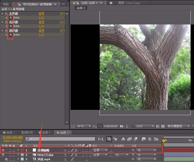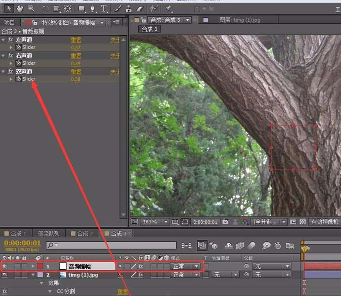 6、再選擇第一層音頻振幅層,用鼠標左鍵按住分割曾德表達式拾取,就是像蝸牛的那個圖標,連接到第一層參數的雙聲道那里。如圖所示。