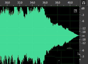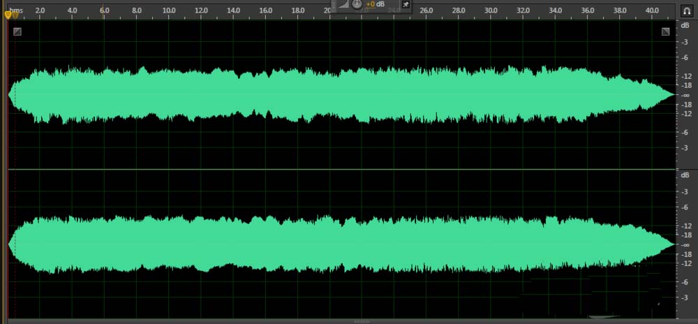 看:波形填滿整個空間,音量分貝快達到零{編輯器中顯示的音量分貝區間是(-∞,0)},零是最大值,接近零說明聲音過大了,而最適宜的音量分貝是(-12,-6)間的。