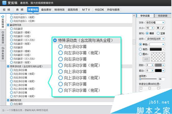 確保在視頻預覽框中,片尾文字內容處于帶方框的可編輯狀態后,在“字幕特效”面板左上角“出現特效”的字幕特效列表中,在“特殊滾動類”欄目,選擇“向上滾動字幕”或“向左滾動字幕”等效果。