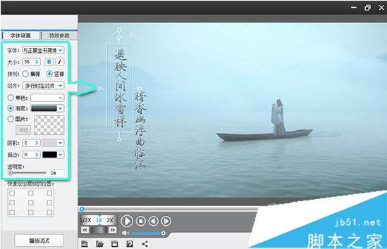 在字幕特效列表右側“字體設置”欄目對片尾字幕的字體、大小、顏色等進行個性化設置,并可在視頻預覽框中,通過拖曳字幕的方框調整字幕位置。