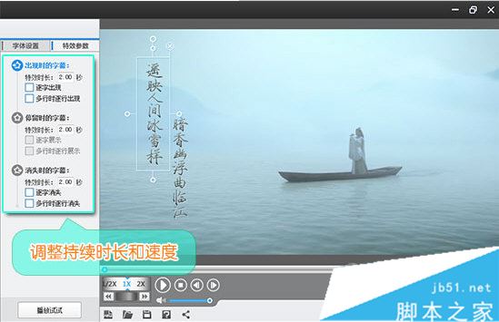 在字幕特效列表右側“特效參數”欄目,在“出現時的字幕:”的“特效時長”處,設置片尾字幕持續時間。同時,持續時長決定了滾動速度,時間越長,滾動越慢,時間越短,滾動越快。