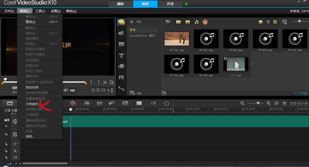 3、拖動到你想要剪輯的地方以后,點擊【編輯】-【分割素材】,視頻就會分割成為2個部分,你多移動幾次,重復步驟2和步驟3,就可以把一個視頻分割成為幾個視頻片段