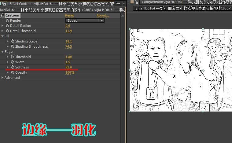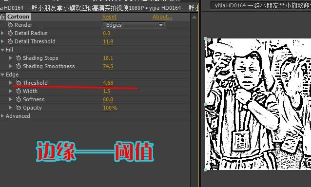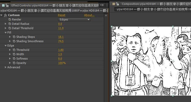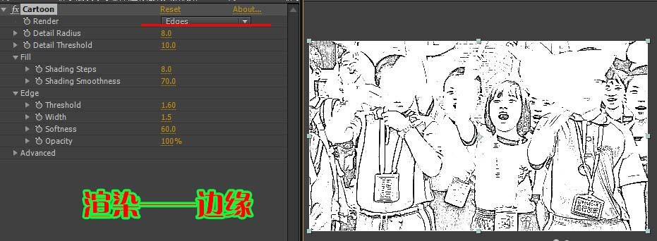 4、現(xiàn)在把卡通特效加入到視頻中,我們首先把渲染效果設(shè)置為“edges",邊緣,得到如圖效果,已經(jīng)是很接近素描的效果了。