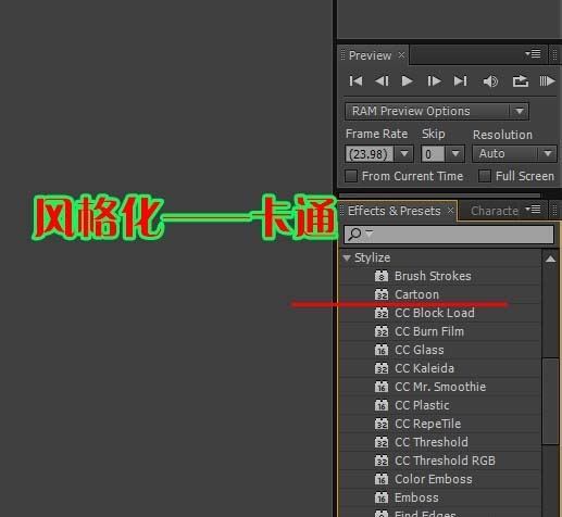 3、根據(jù)需要新建合成,把我們的視頻拉到合成中,然后在特效面板找到“stylize——carton”,中文版的“風(fēng)格化——卡通”,可以直接搜索卡通特效。
