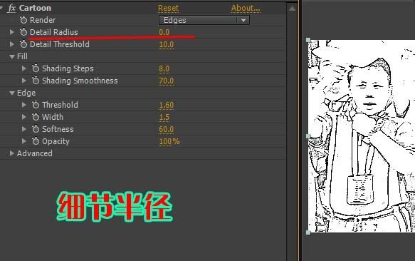 5、現(xiàn)在給大家說一下卡通特效里面的參數(shù)。首先是”detail radius",細(xì)節(jié)半徑,數(shù)值越多,細(xì)節(jié)越多,但是對于素描來說細(xì)條就越雜,所以這個參數(shù)不應(yīng)該太大。