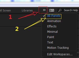 3、可是按原來的解決方法不行,沒有預(yù)覽控制臺,我嘗試了其他的解決方法點(diǎn)擊 ”庫“右邊的“》”出現(xiàn)10多個(gè)選項(xiàng),鼠標(biāo)點(diǎn)擊“所有面板”。英語版的同理也是