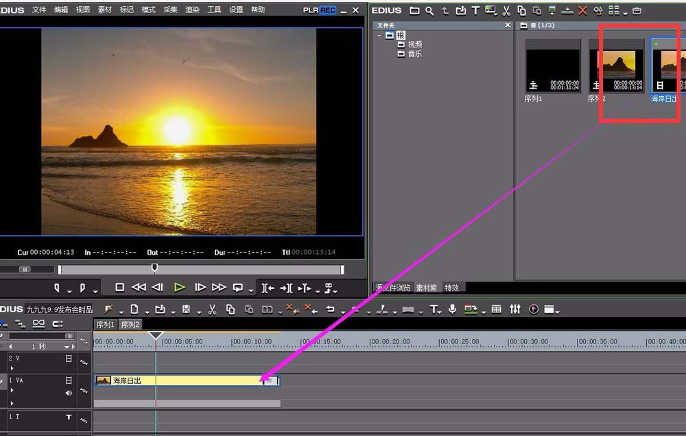 1、首先就是將素材庫(kù)中的視頻文件拖拽到時(shí)間線上