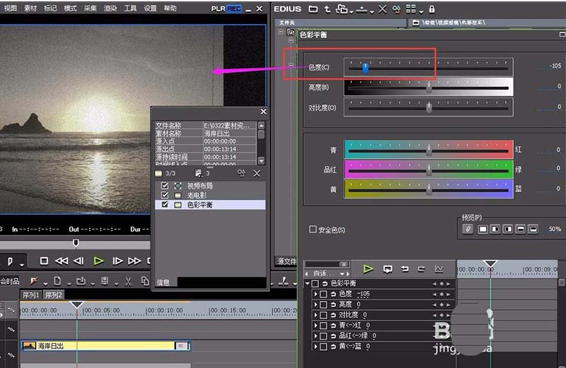 6、在色彩平衡里面,我們將“色度”盡量調(diào)小,讓整個(gè)視頻呈現(xiàn)近似于黑白色調(diào)。老電影效果更逼真。