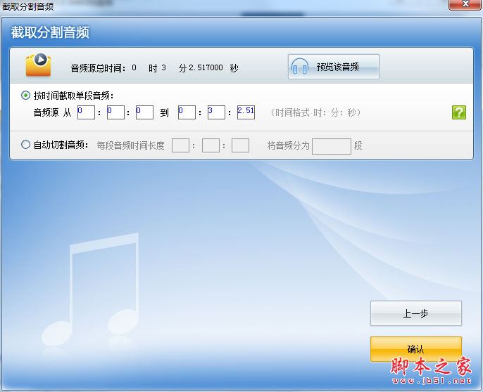 4、點擊下一步后它會彈出一個音頻分割界面,如果你不想分割我們添加的音樂那就直接點擊“確定”;